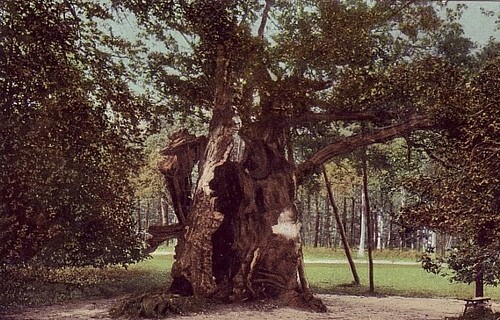 An old tinted postcard of the Shambles Oak which had hooks for hanging meat inside the hollow trunk.