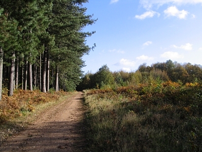 The old coach road at the top of the ‘Long Stoop’ in Shwerwood Pines. Robin Hood’s Whetstone is just beyond the heathland on the right.
