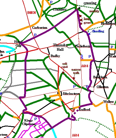 There is a cafe and seats in Old Ollerton, so it is a good place to stop. The old finger-post points to Newark – with a right turn just before the main road into Bescar Lane. At Wellow Lane its right towards Rufford ford.