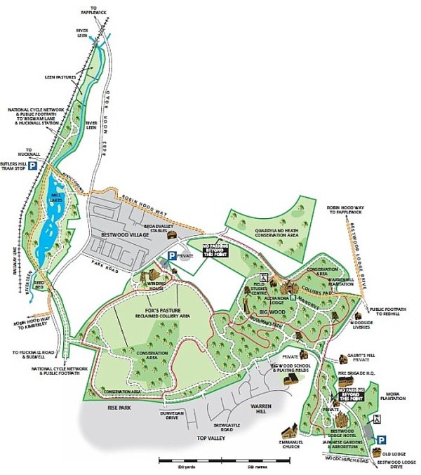 Bestwood Country Park is a former royal hunting park just north of Nottingham is crossed by the Robin Hood Way and National Cycle Route 6. Get a pdf version of the map below.
